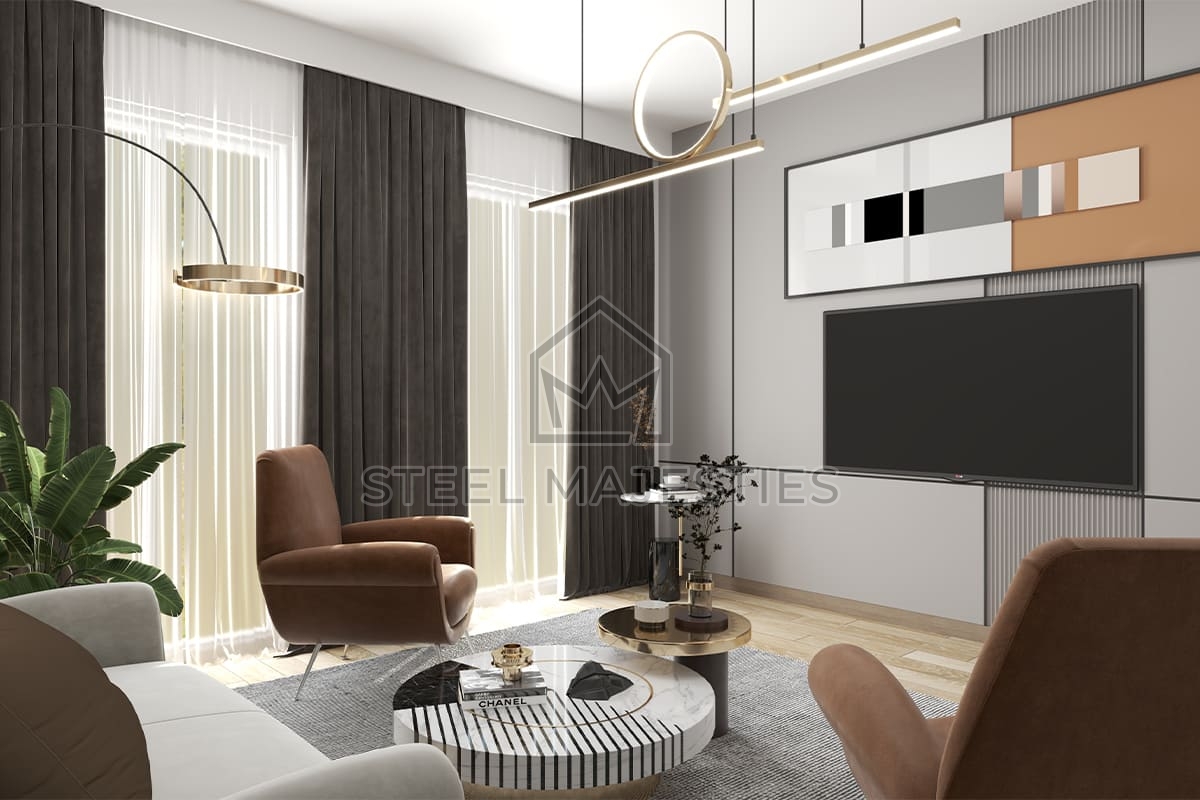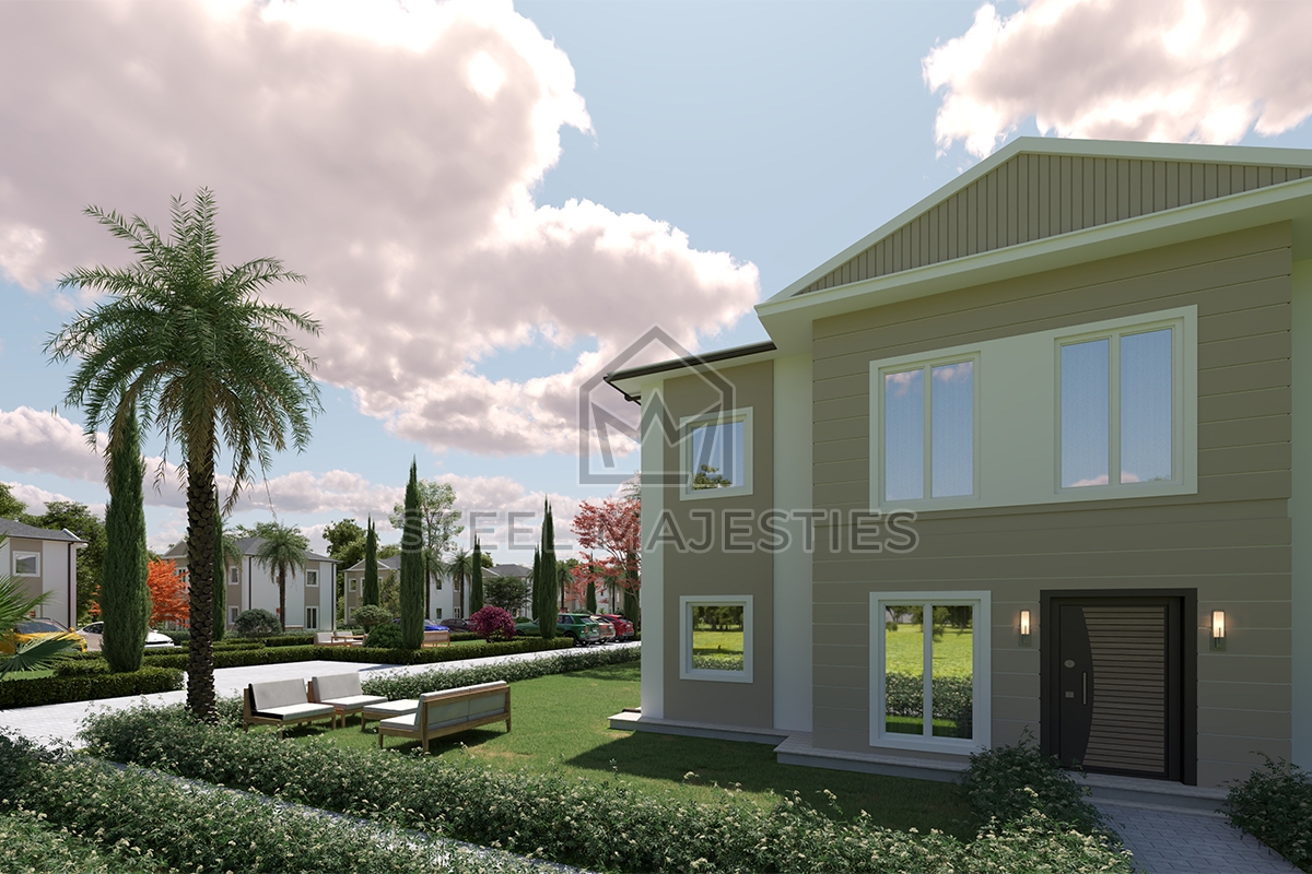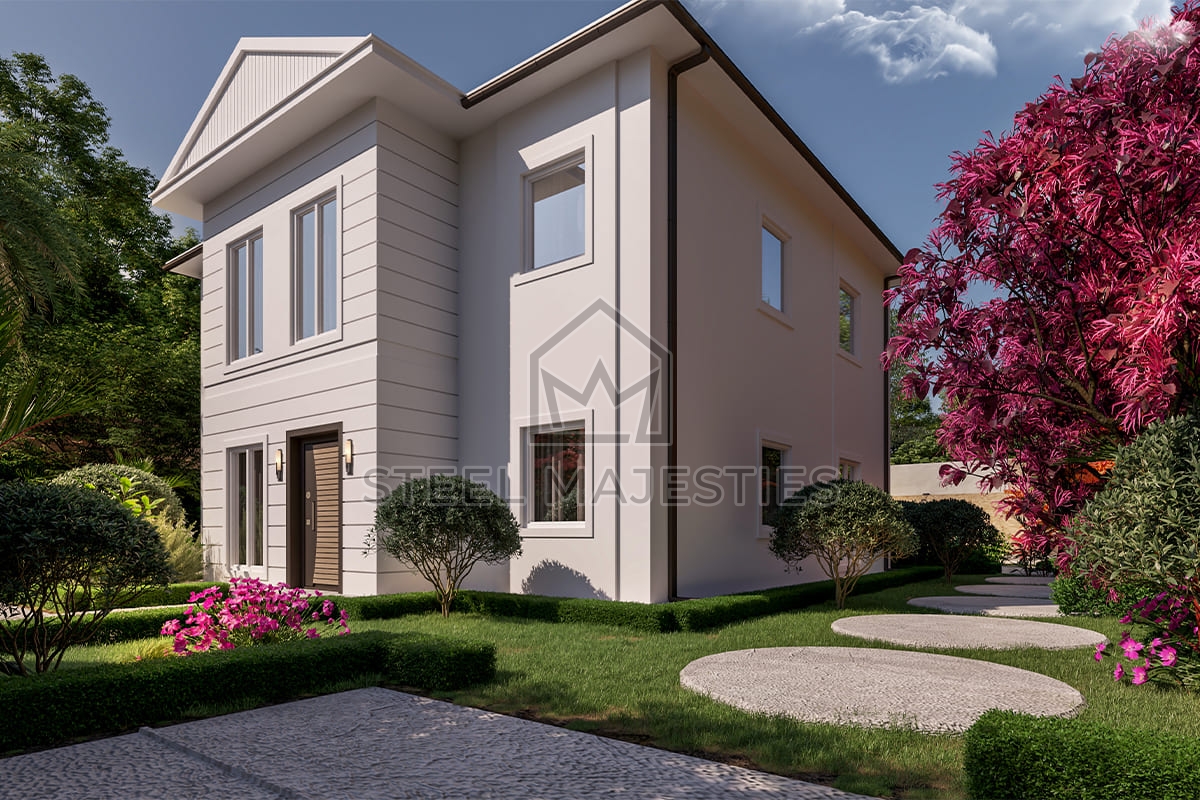 Mit seinem innovativen System, das den Weg zum Eigenheim erleichtert, lässt das 200 m² große Fertighausmodell Träume Wirklichkeit werden. Innovative Designs in Kombination mit der Stahlkonstruktion des Fertighauses gewährleisten unvergleichliche Sicherheit in luxuriösen Wohnhäusern. Das Fertighaus ist ein sicheres Wohnmodell, das für die schönen Momente des Lebens konzipiert wurde.