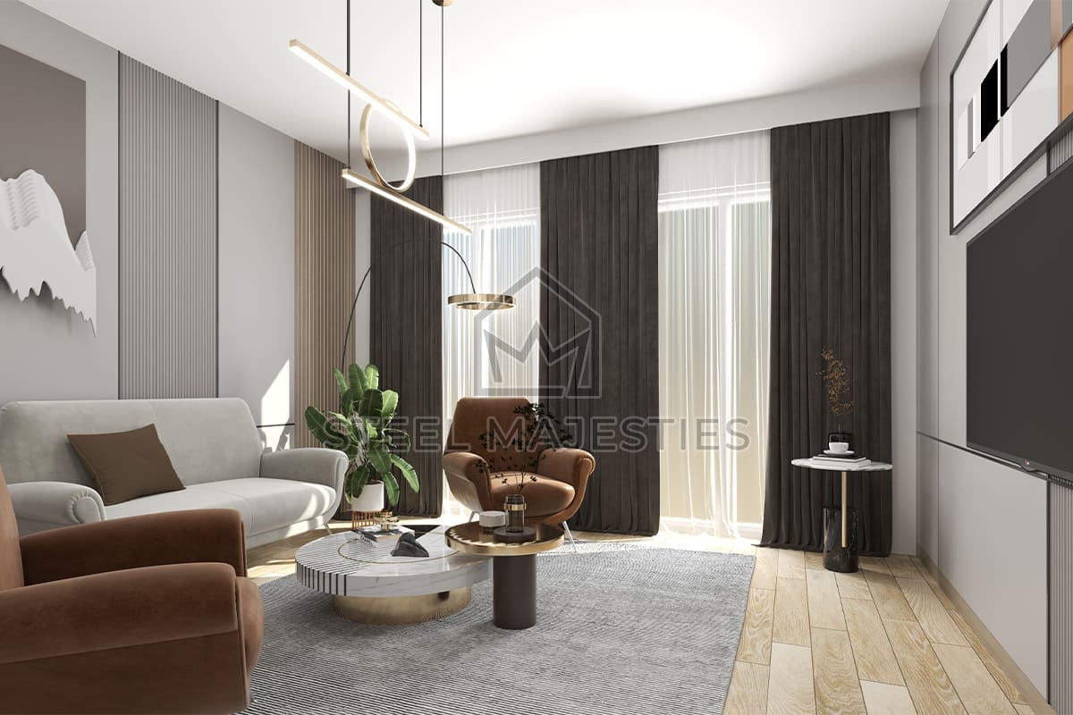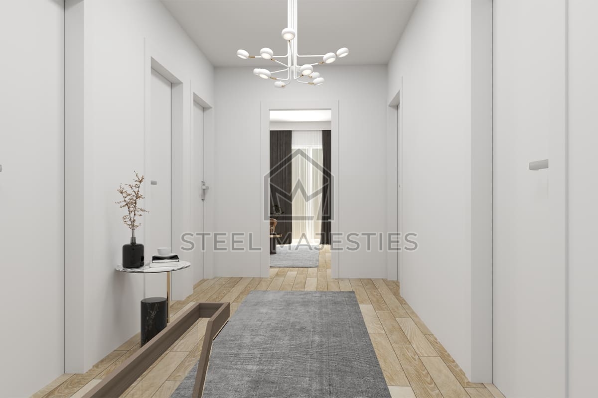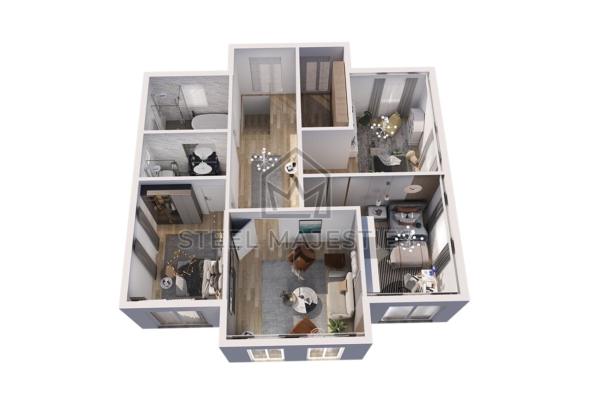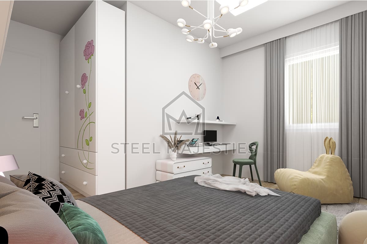 Mit seinem innovativen System, das den Weg zum Eigenheim erleichtert, lässt das 200 m² große Fertighausmodell Träume Wirklichkeit werden. Innovative Designs in Kombination mit der Stahlkonstruktion des Fertighauses gewährleisten unvergleichliche Sicherheit in luxuriösen Wohnhäusern. Das Fertighaus ist ein sicheres Wohnmodell, das für die schönen Momente des Lebens konzipiert wurde.