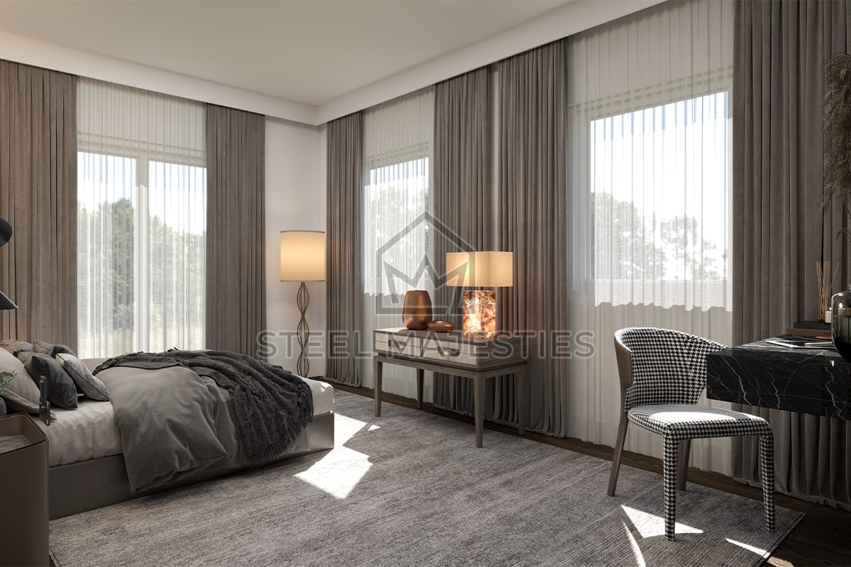 The 187 m² size is expertly allocated into 5+2 living spaces to provide the best comfort. Experience the privileges of independent living by creating beautiful memories filled with happiness in a prefabricated villa.