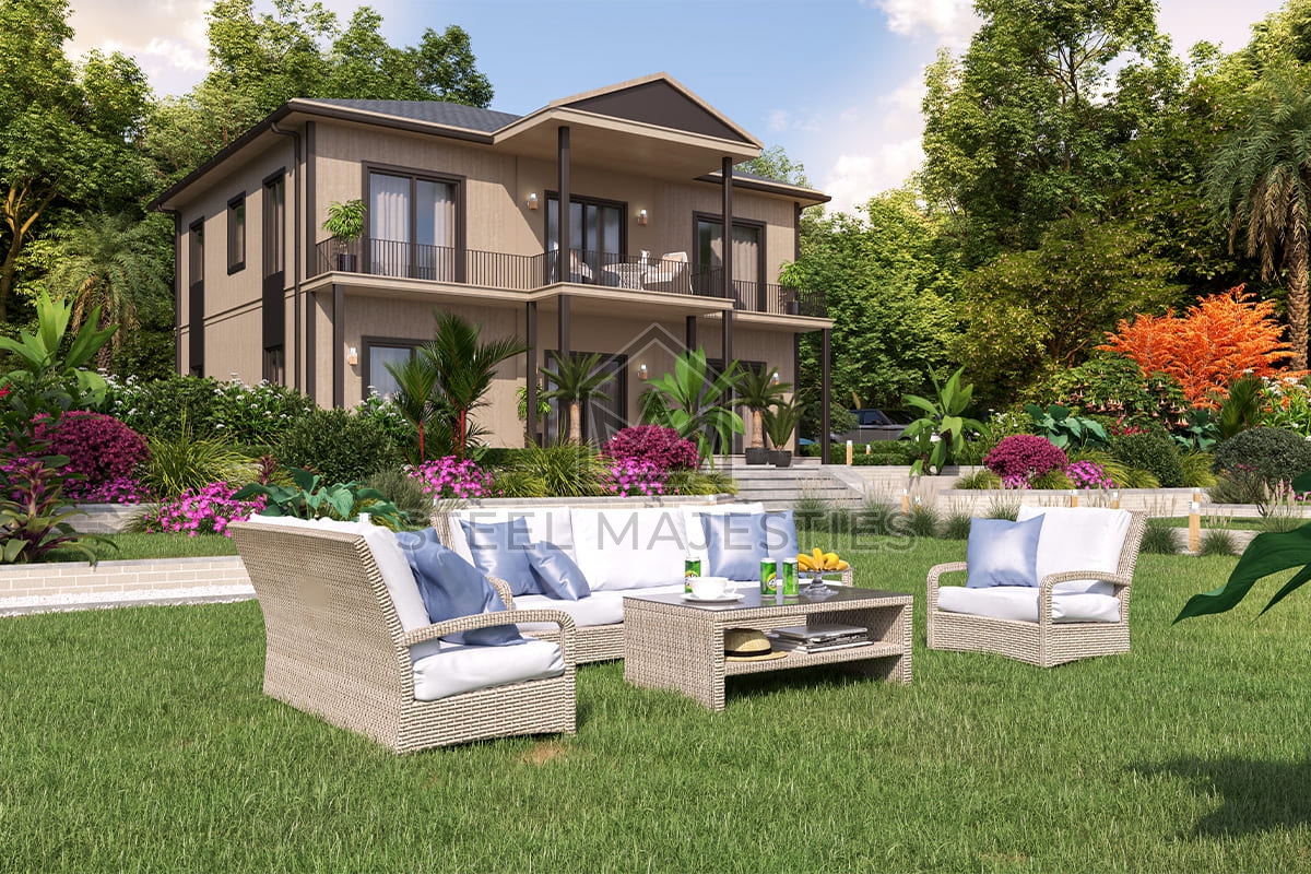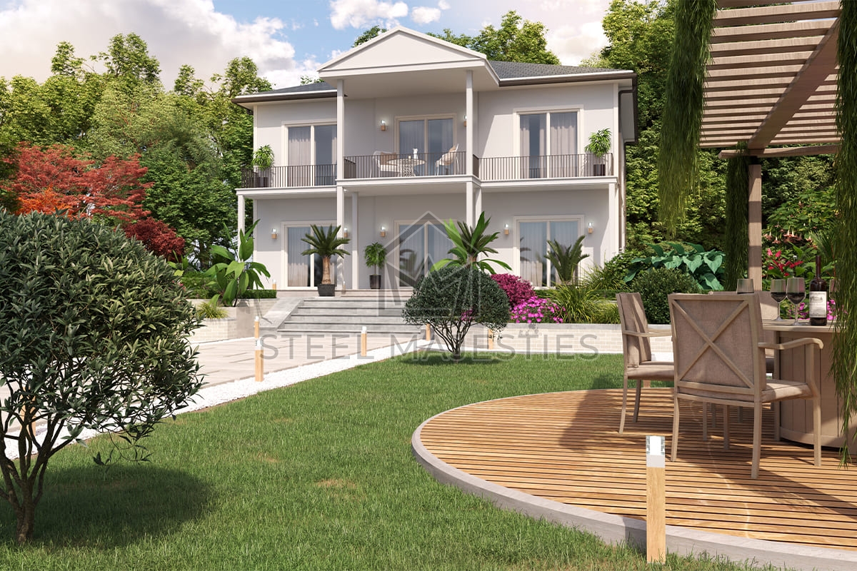 The 222 m² size is expertly allocated into 6+2 living spaces to provide the best comfort. Experience the privileges of independent living by creating beautiful memories filled with happiness in a prefabricated villa.