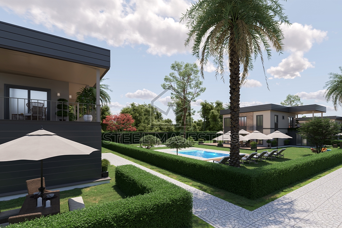 The 274 m² size is expertly allocated into 6+1 living spaces to provide the best comfort. Experience the privileges of independent living by creating beautiful memories filled with happiness in a prefabricated villa.